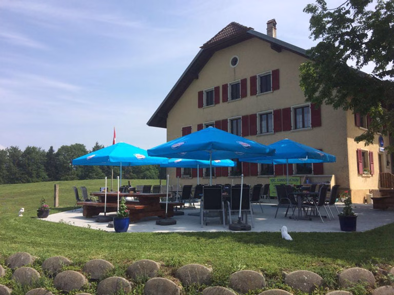 Das Restaurant liegt eingebettet in die Landschaft rund um Courcelon und bietet eine unverbaute Aussicht auf Jura-Hügel und Wälder.