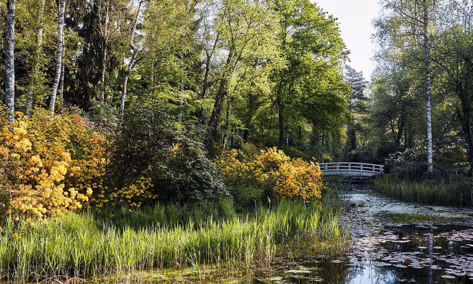 Von April bis Juni entfaltet der Park eine spektakuläre Blütenpracht mit Tausenden von Rhododendren und Azaleen. Ergänzt wird dies durch Seerosen, Farne und idyllische Spiegelweiher entlang eines barrierefreien Rundwegs.
